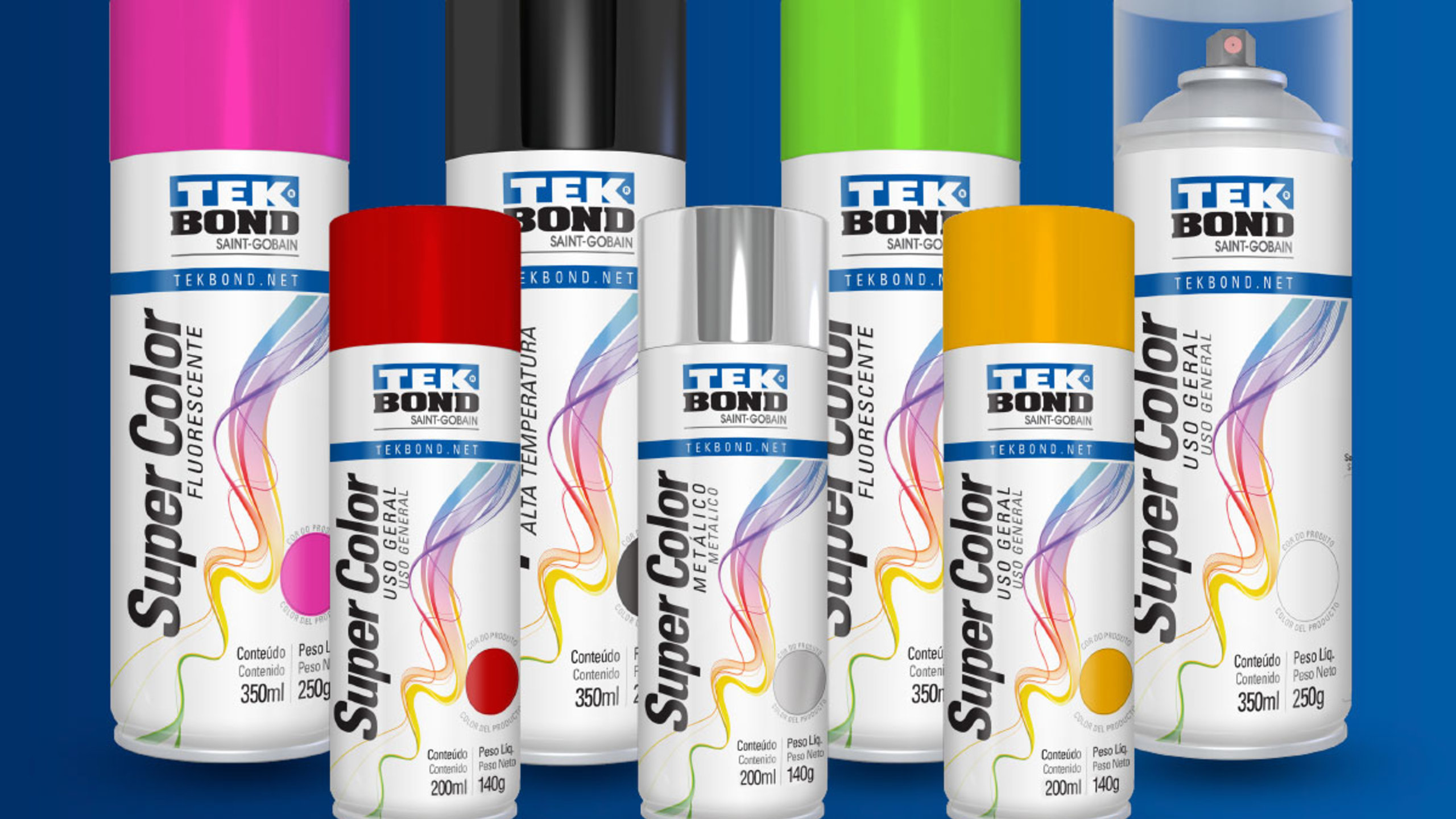 Las pinturas en aerosol Supercolor Tekbond ya contaban con las siguientes presentaciones: línea de uso general (brillantes, mates y pastel), la línea de metalizados, además de colores fluorescentes y de aerosoles de alta temperatura. Todos ellos en su versión de 350ml / 250g.